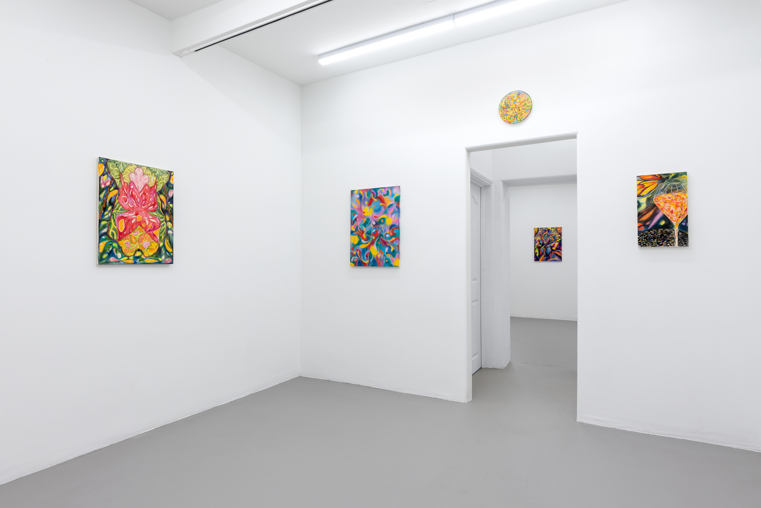 Flor likes to give their subjects, materials, & themes they work with equal agency over their language & representation. How does Flor do that? They channel Kiki, a conceptual personae. Flor employs rituals to embody her… a spray of perfume, a Kiki playlist playing in the background, a Kiki dance in between brushstrokes… Flor becoming Kiki subverts authorship. From there, the paintings develop their own intuitive language by breaking in & out of symmetry, playing with mirrorings, & mimicking her changing environment. Kiki is always shifting forms, so she likes to be painted in many different ways… exploring ways of seeing, perceiving, & multi-sensing. What is it to see & sense like a queer monarch butterfly, who likes to dance, to befriend other queer beings? Kiki’s journey is about queer belonging… what is it like to dream & manifest new potentialities?